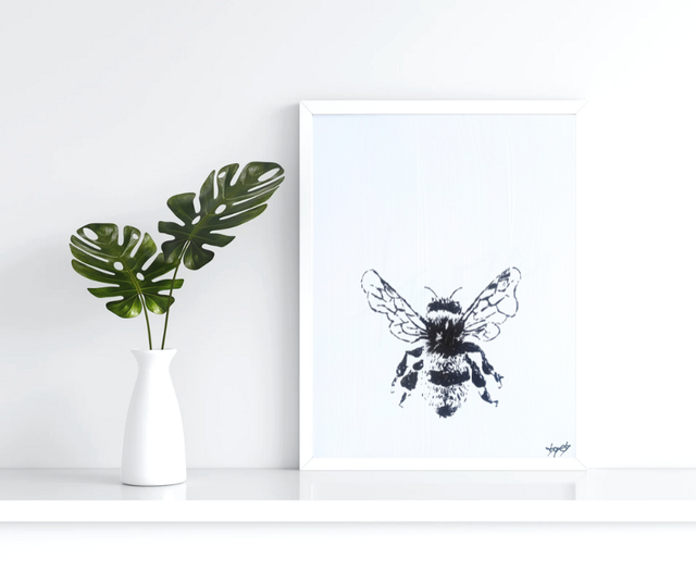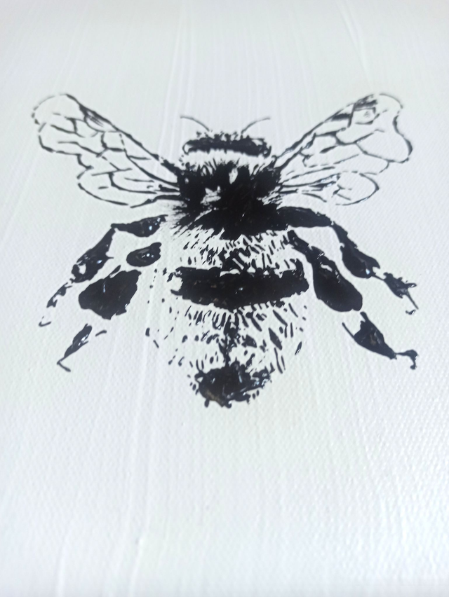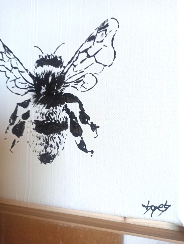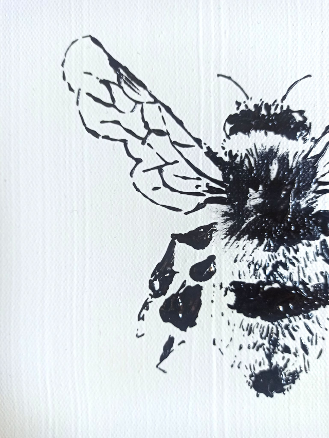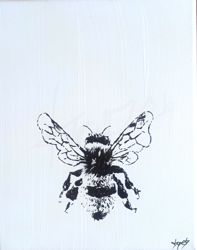 J'ai réalisé cette peinture afin de dévoiler comment un simple coup de pinceau épuré pourrait représenter un être vivant. L'utilisation de la peinture noire sur fond blanc crée la contre-forme idéale pour ressortir les détails de l'abeille.
